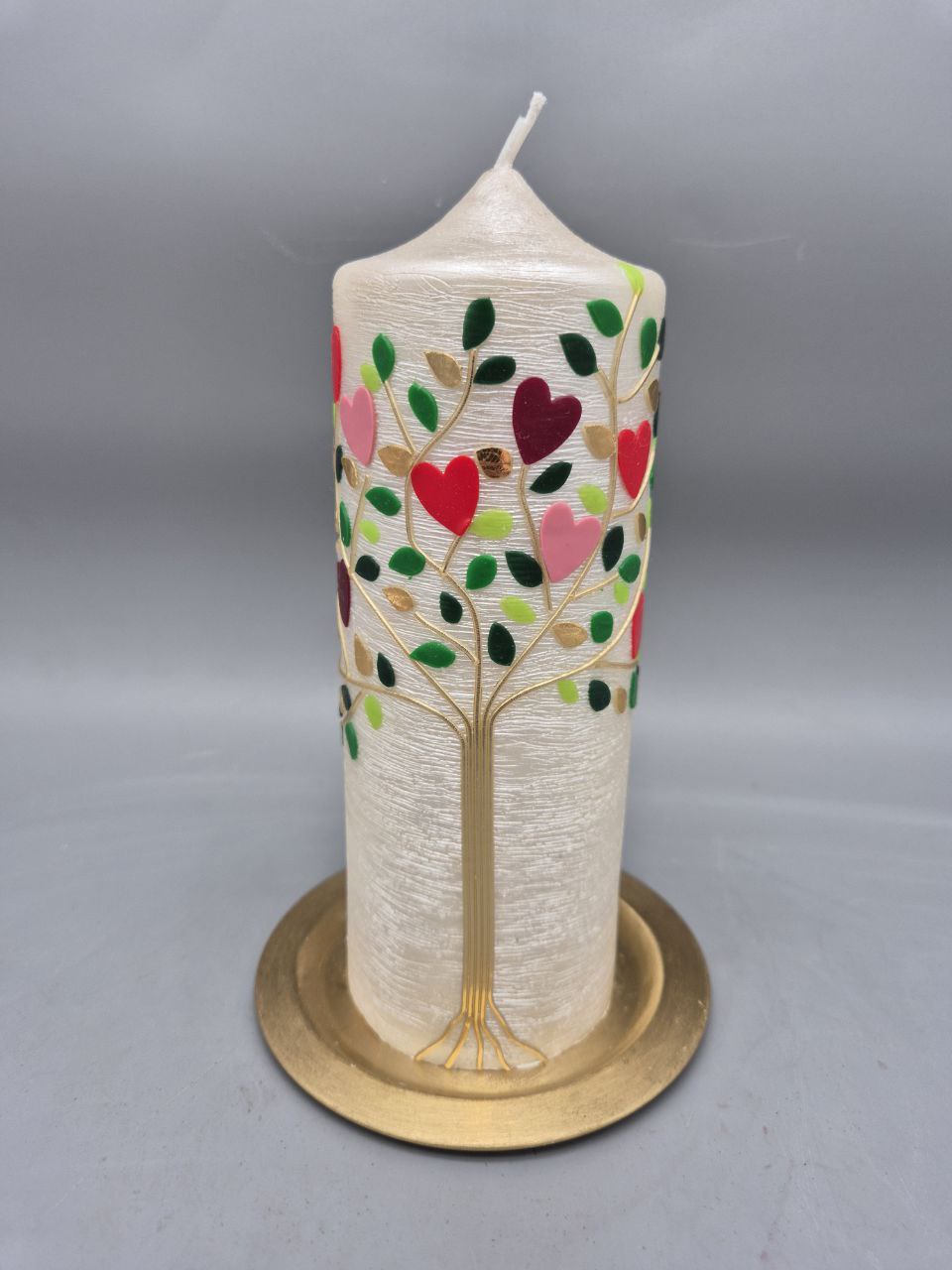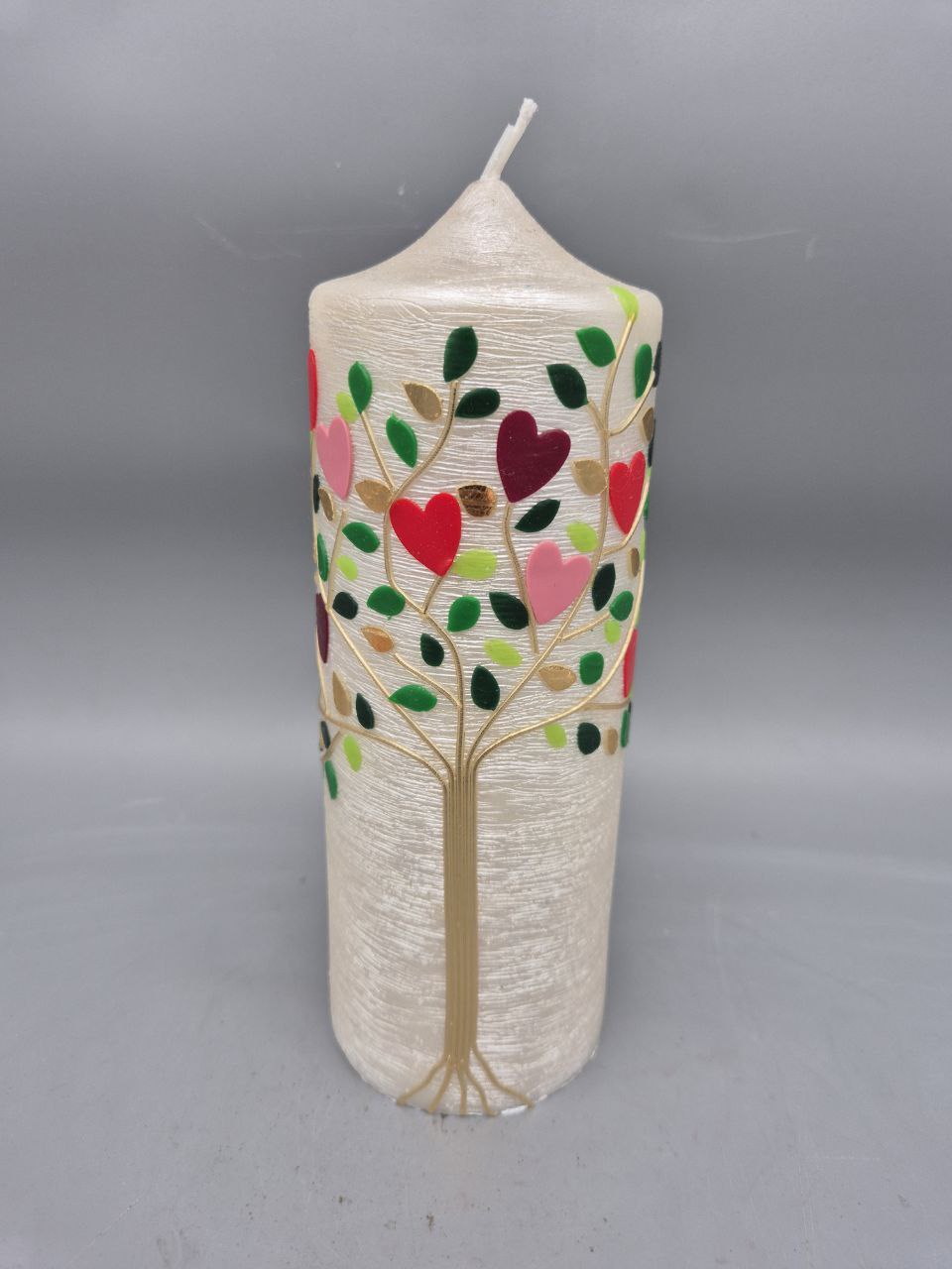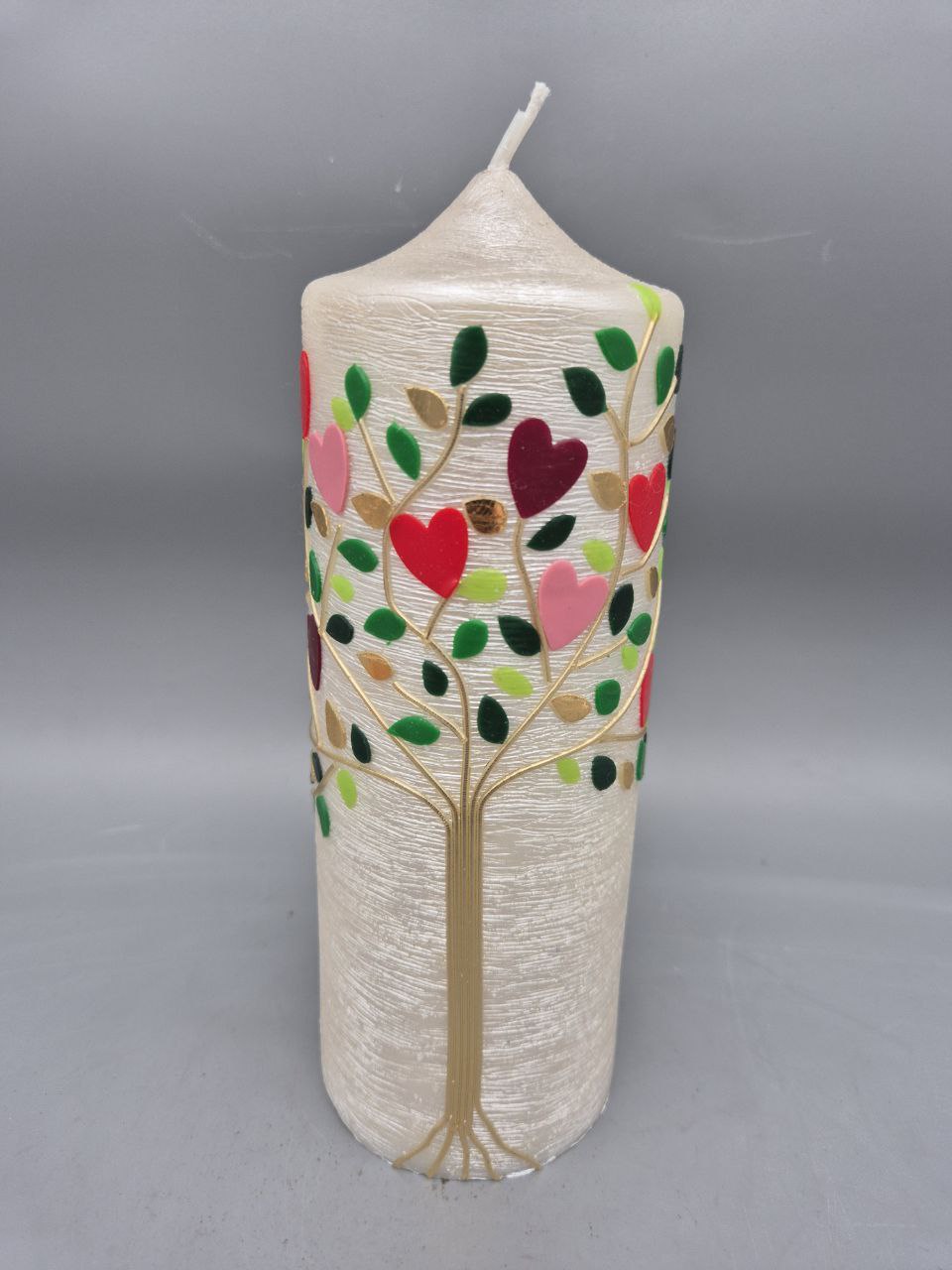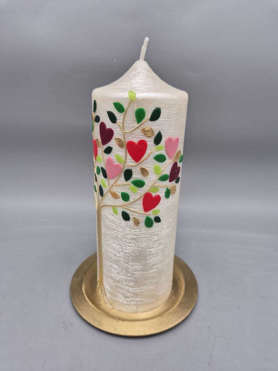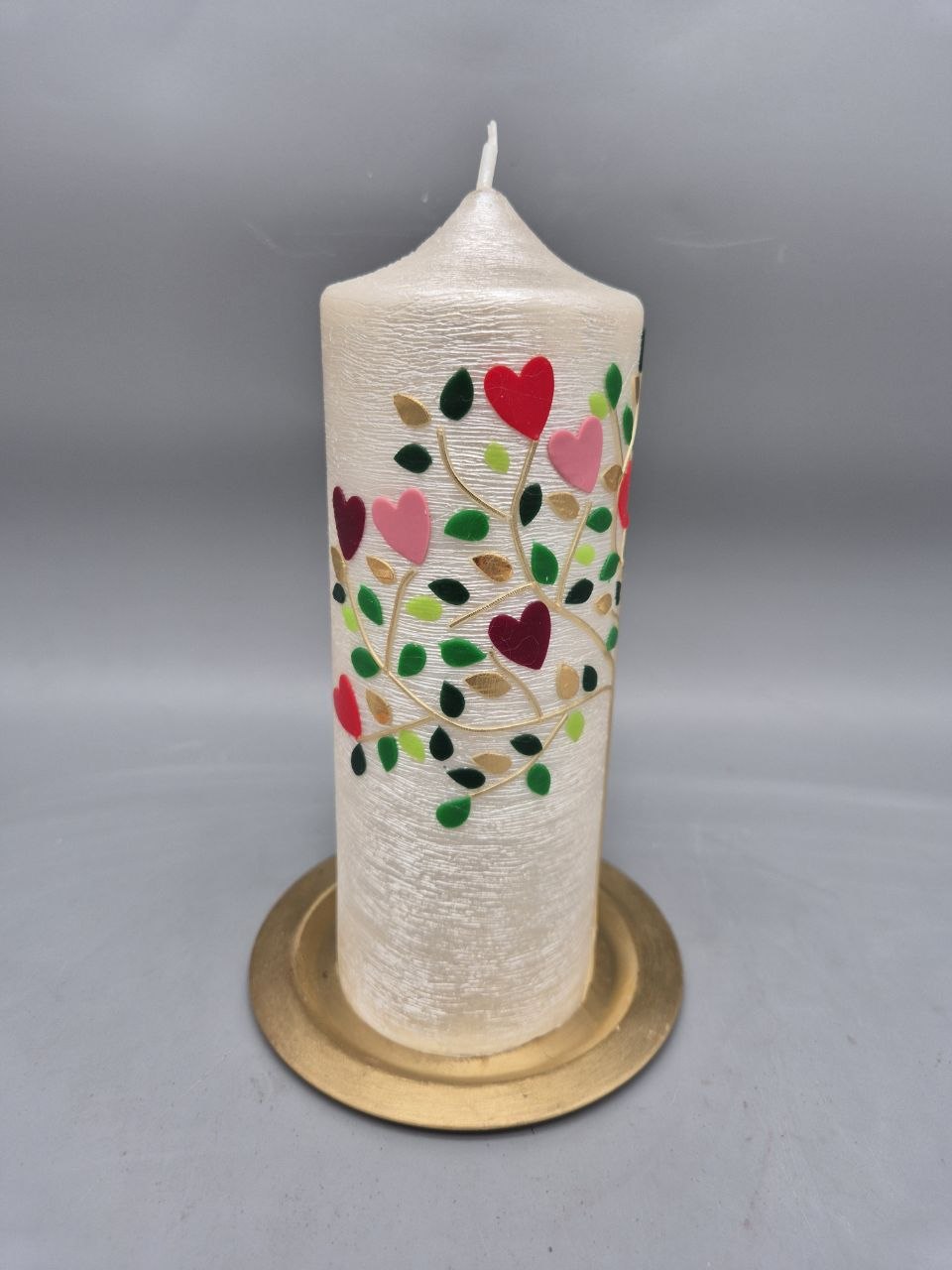Wunderschöne Hochzeitskerze mit Perlmutt-Struktur und weit auf die Seite der Kerze reichende Zweige mit Blättern und Herzen