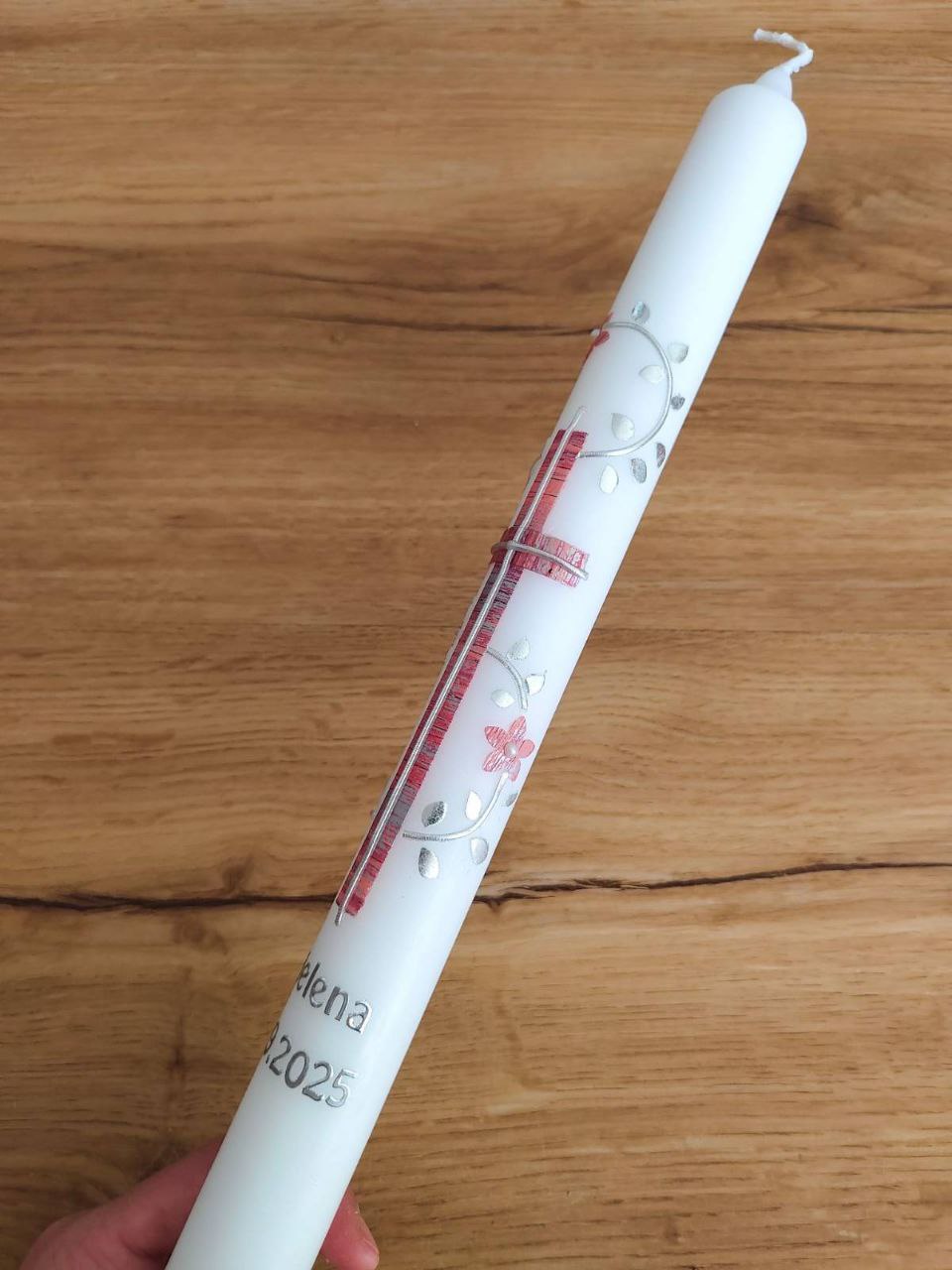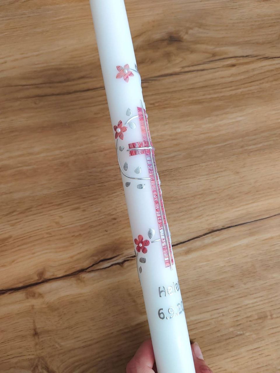 Motiv: Wachsmotive: Kreuz, Blätter-Blumenranke, personalisiert mit Namen und Datum in Silber