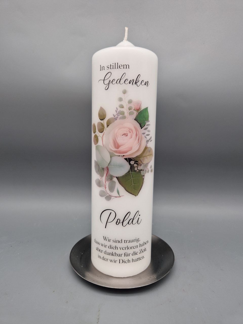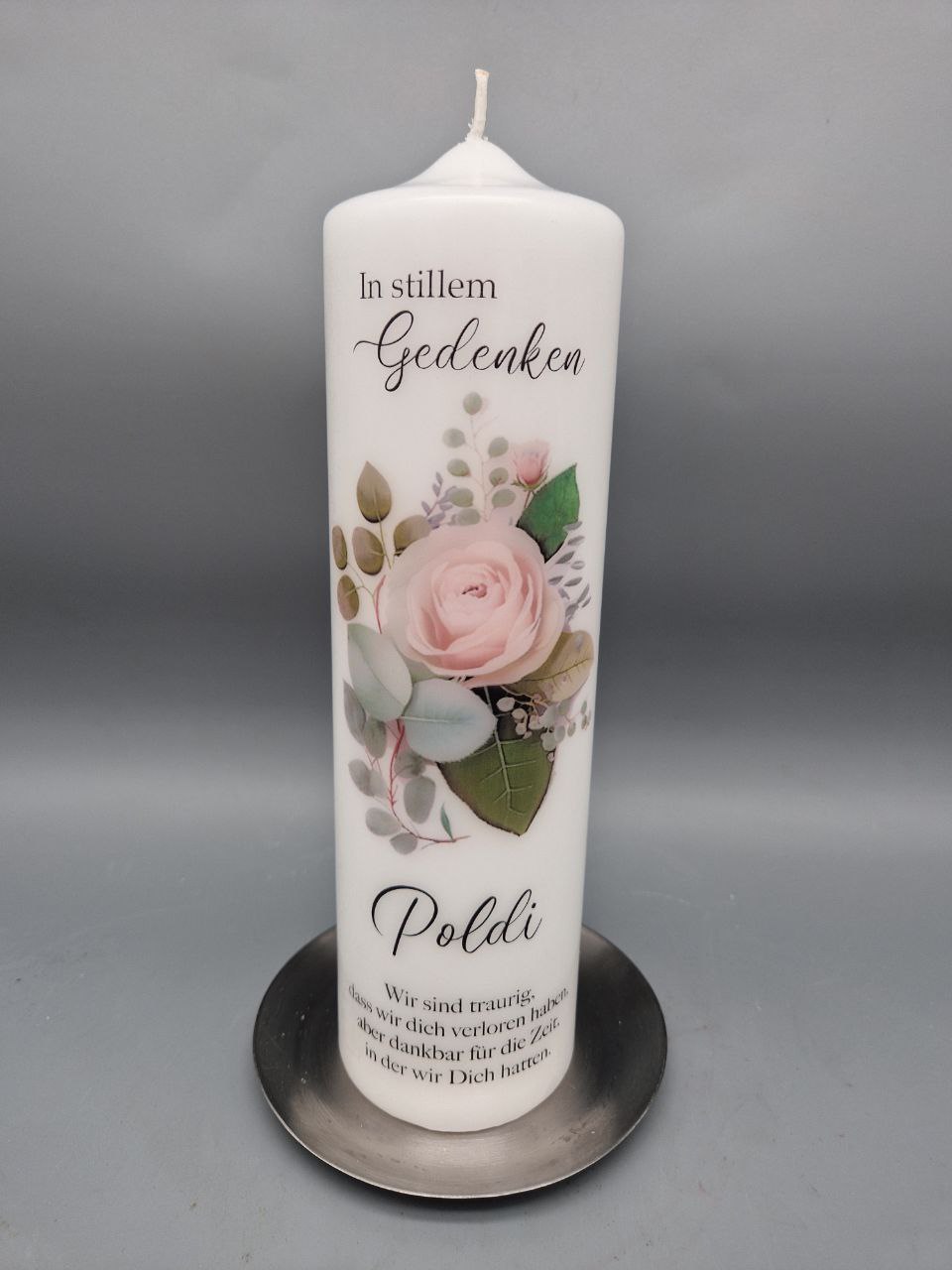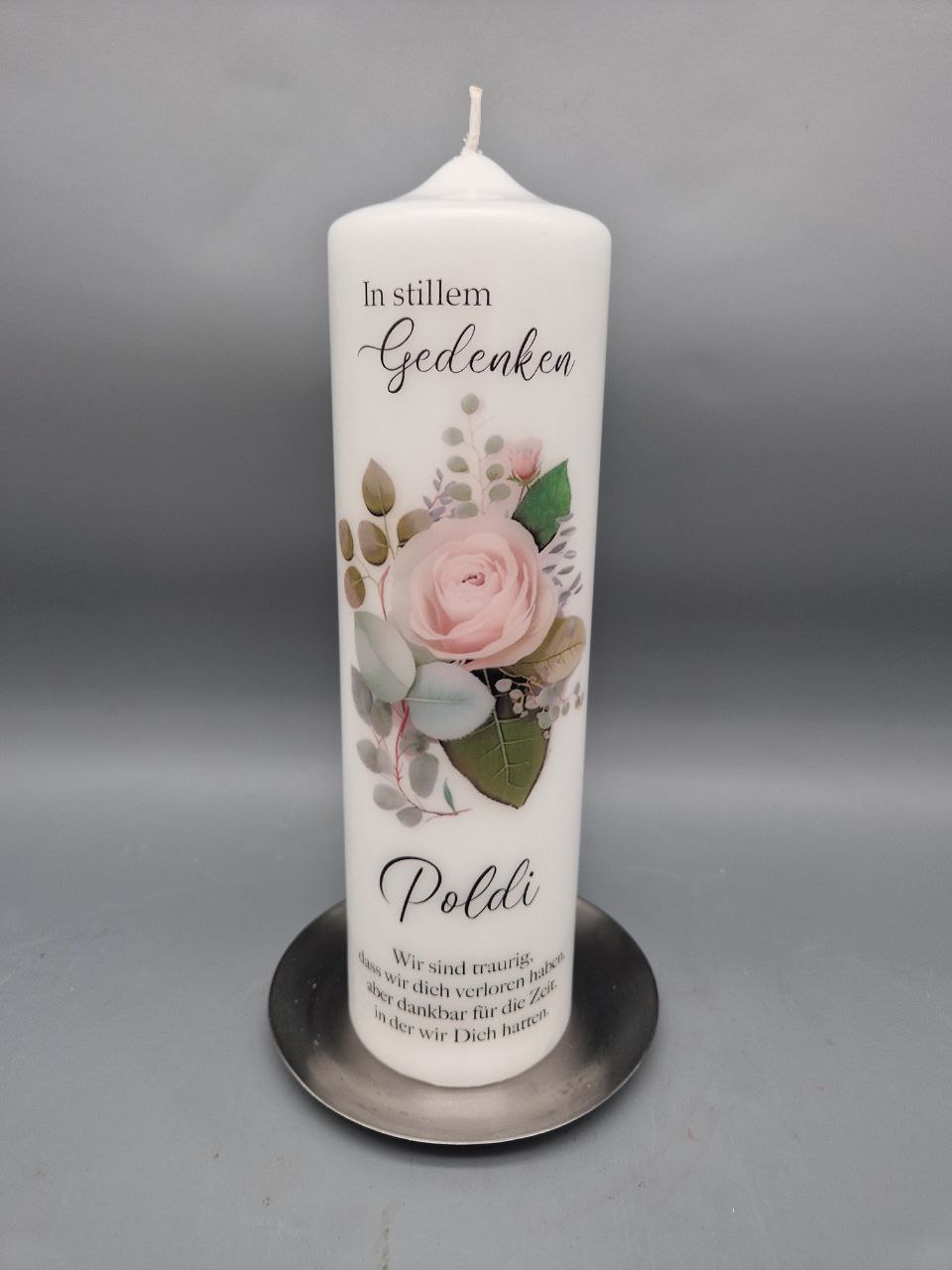Diese bedruckte Stumpenkerze vereint geschmackvolles, Blumen-Design mit tiefer Bedeutung. Wunderschöne Trauer oder Gedenkkerze für deinen Verstorbenen.