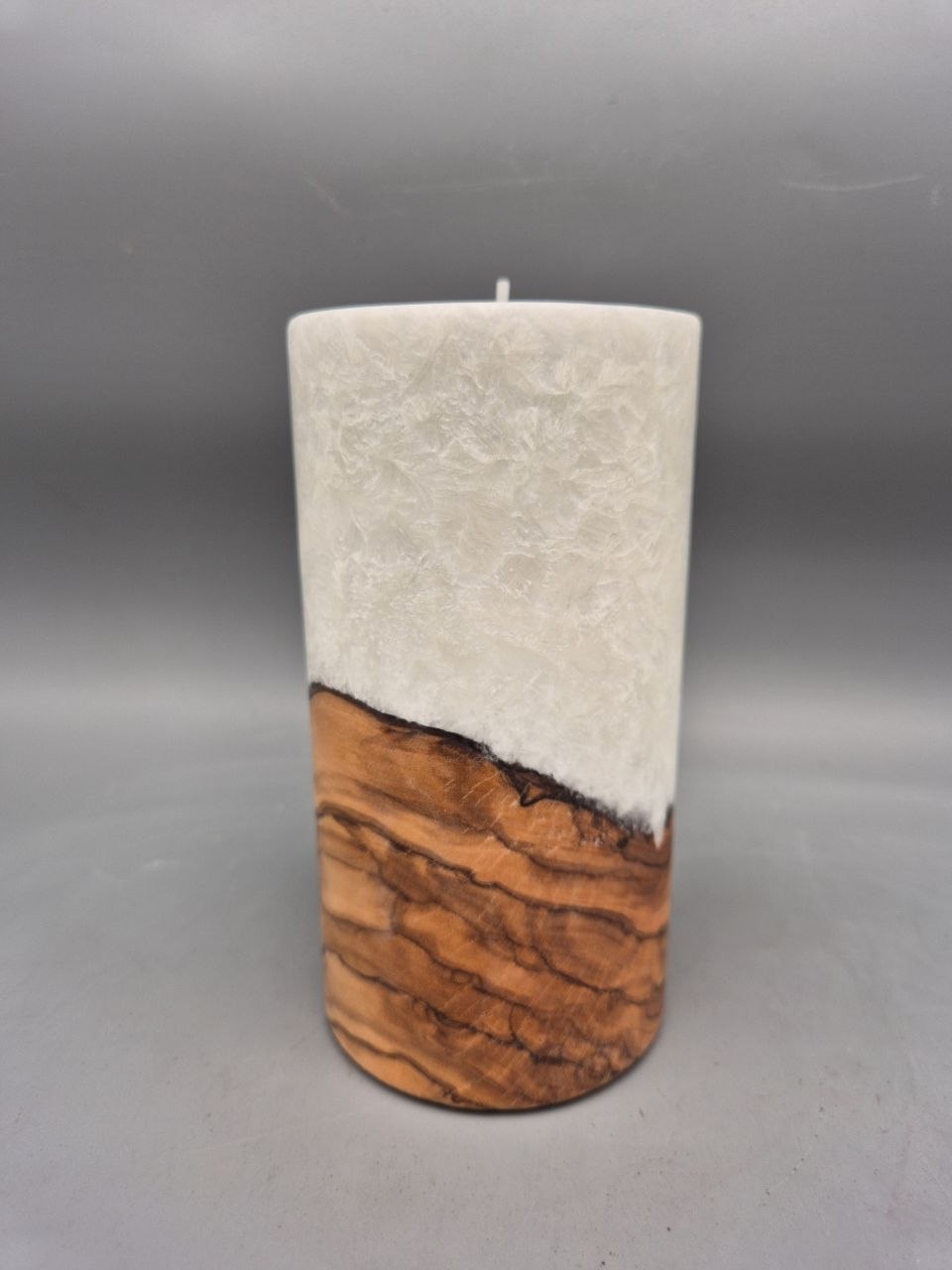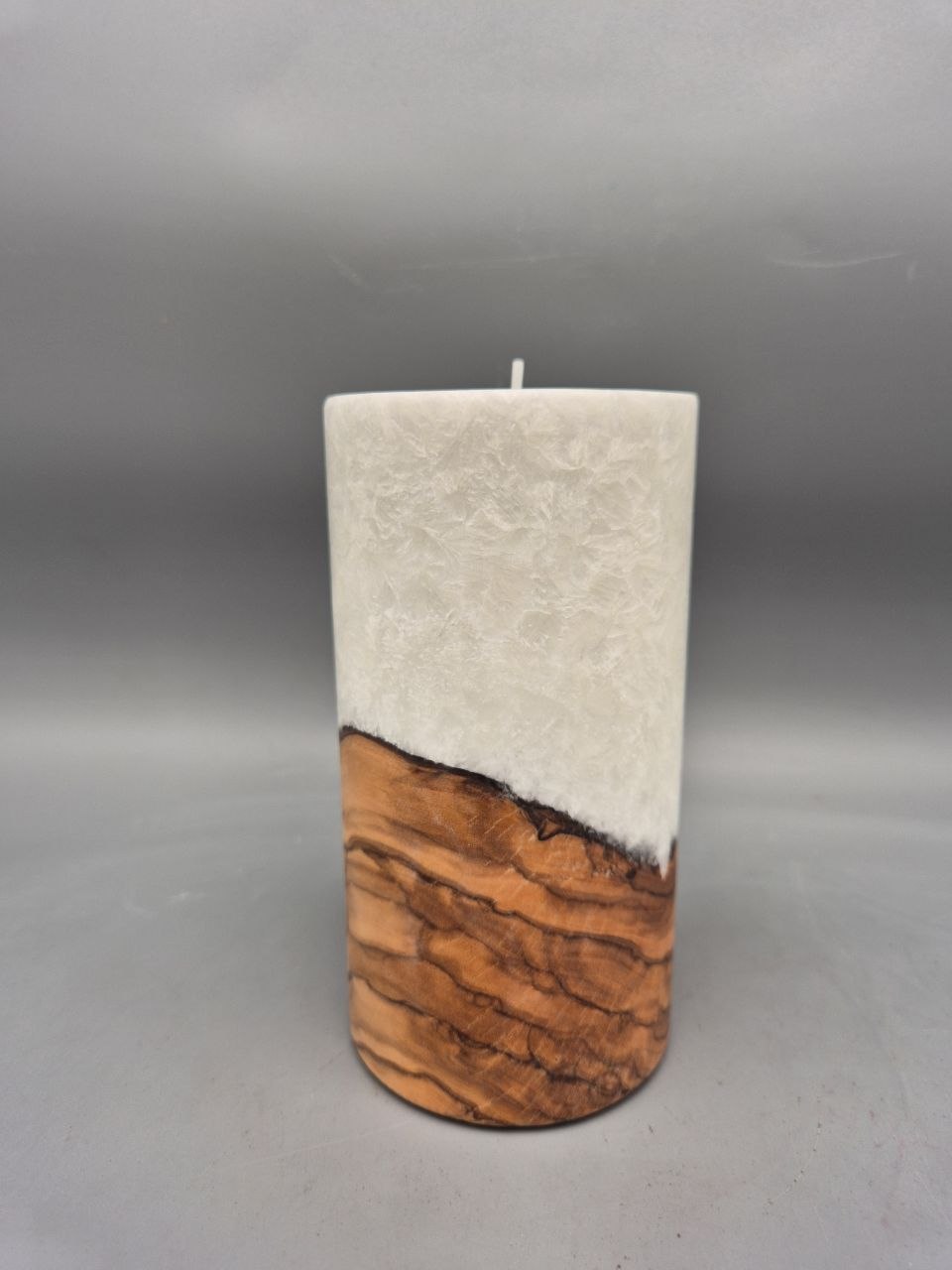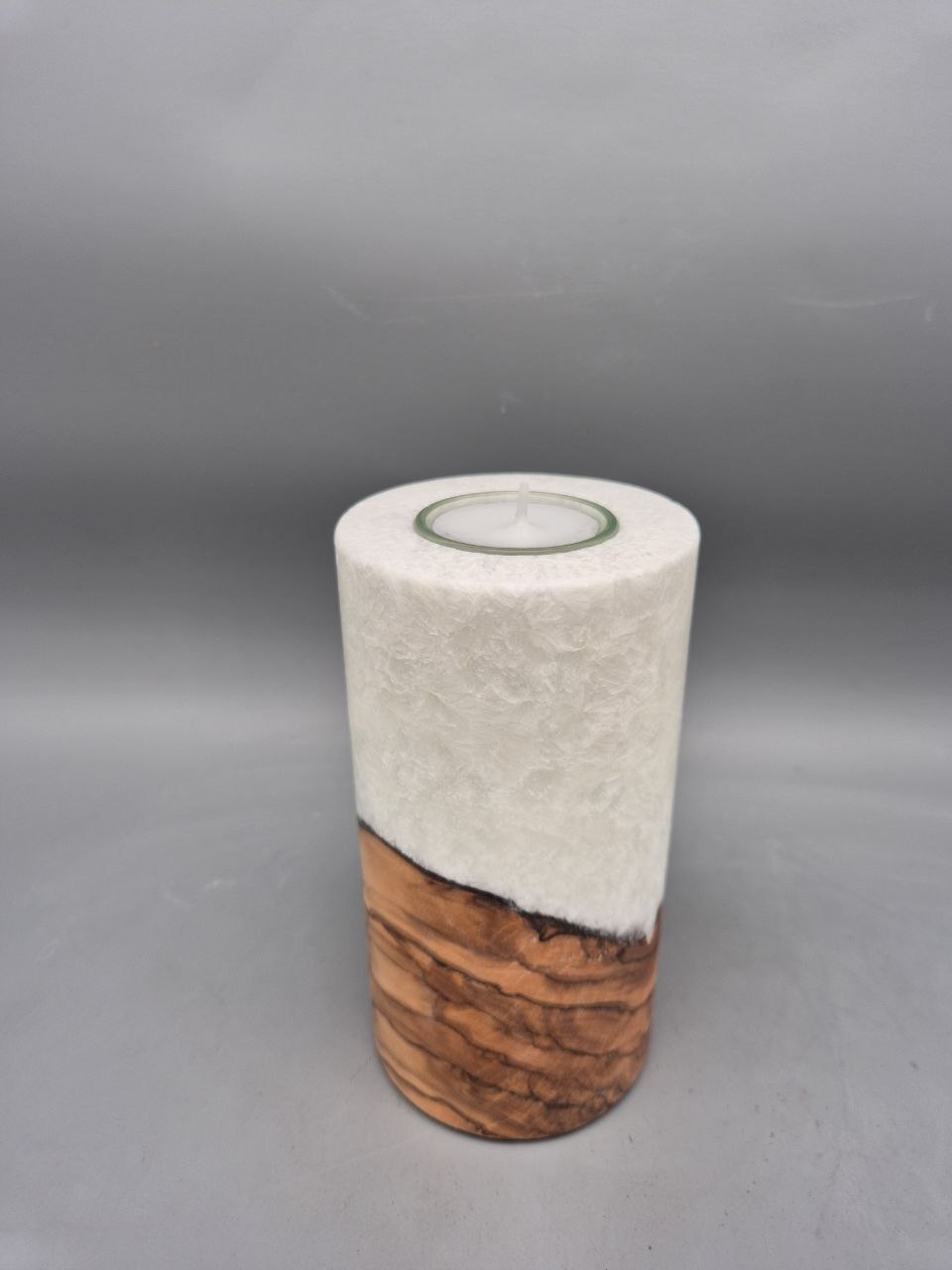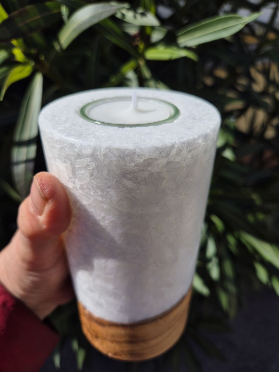 Produkt: Stumpenkerze mit Echtholzstück und Teelichteinsatz, inklusive Karton